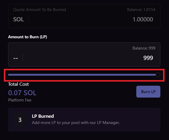 Now slide to determine the amount of LP tokens you want to burn and click on the Burn LP button.